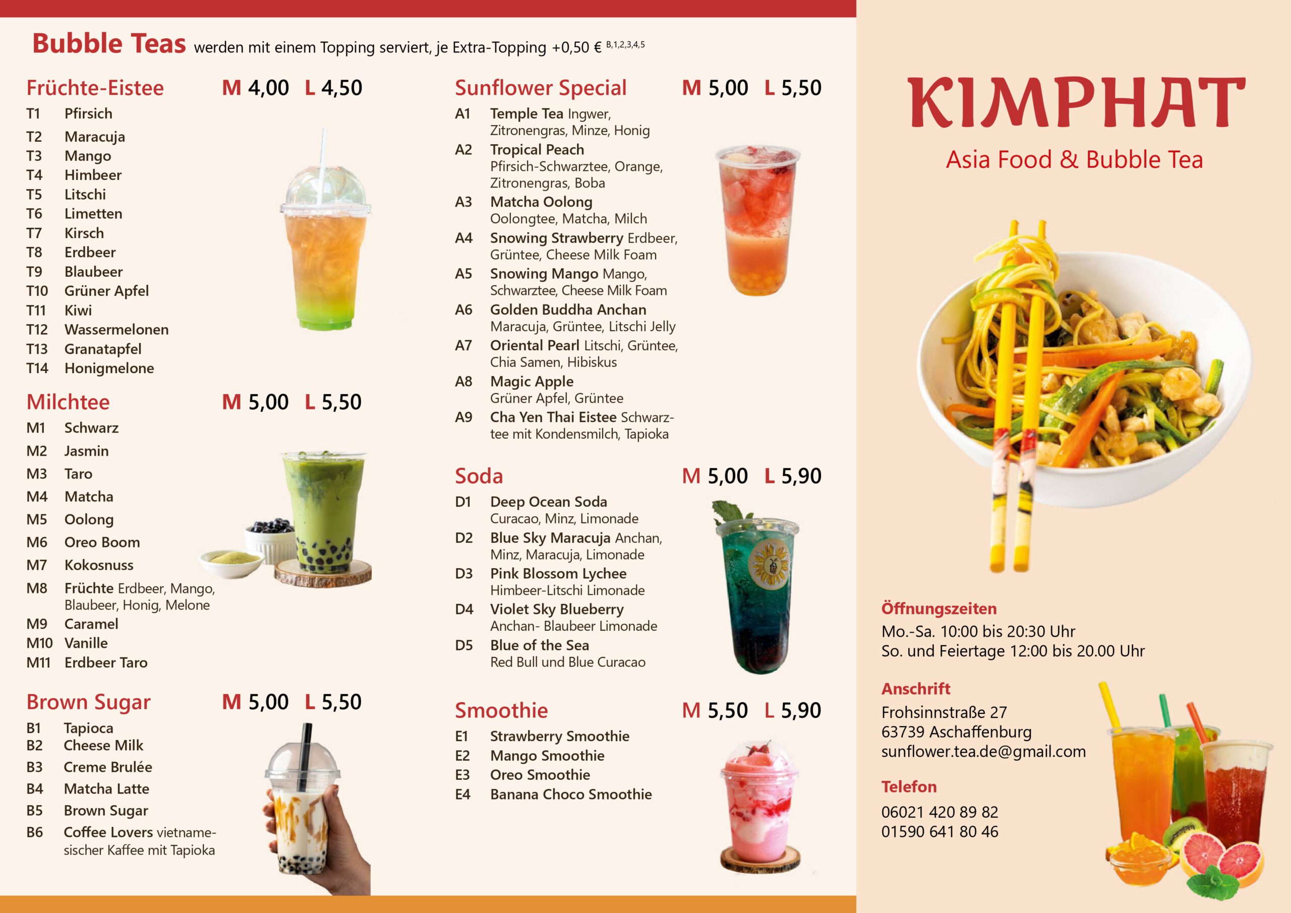 Asiatische Köstlichkeiten per Anruf oder vor Ort – von Gyoza bis Sushi, von Asian Box to Go bis Poke Bowls. Tauche ein in unsere Sunflower Bubble Tea Welt: Fruit Tea, Milk Tea, Brow Sugar, Sunflower Special Tea – Hier wird Genuss zum Erlebnis!